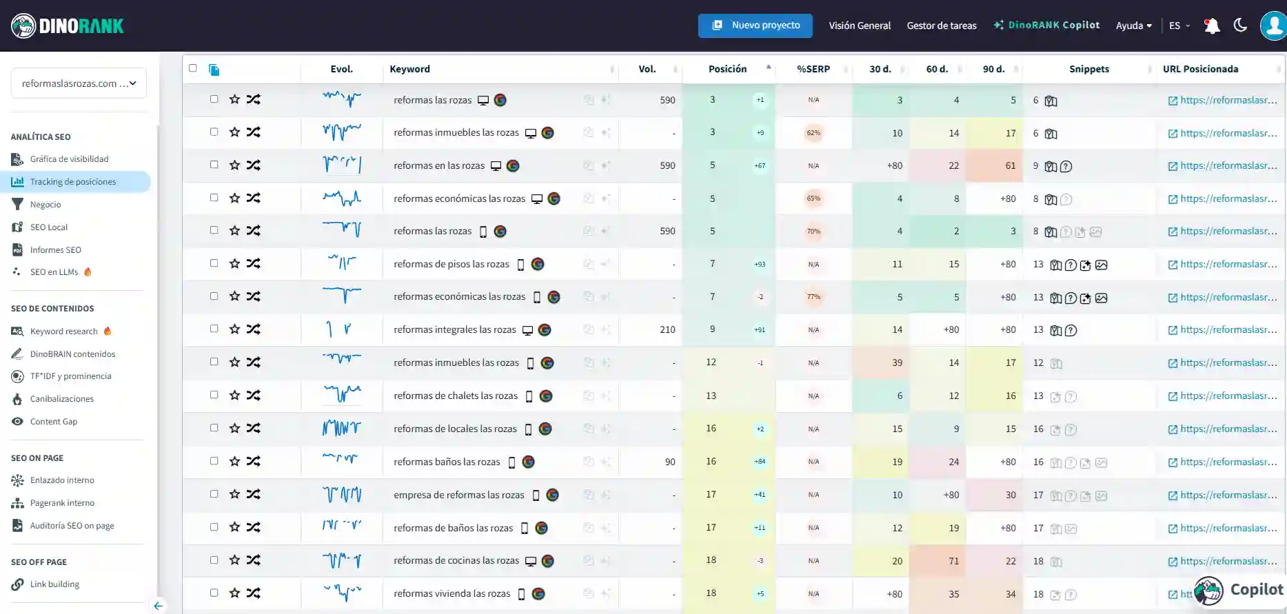 Este gráfico muestra el seguimiento y la evolución de las posiciones de distintas keywords relacionadas con reformas en Las Rozas tras aplicar la estrategia SEO